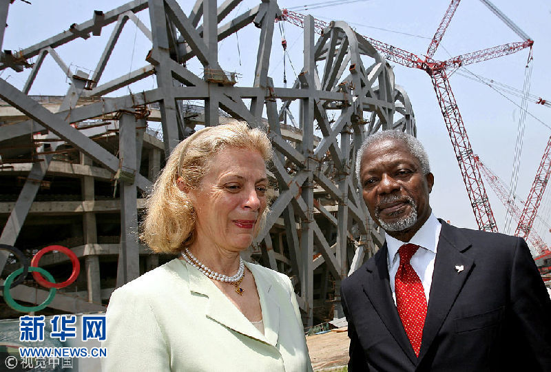 2006年5月23日,北京,安南和他的妻子娜内·安南参观建设中的北京奥运会主会场———国家体育场。(图片来源:视觉中国)