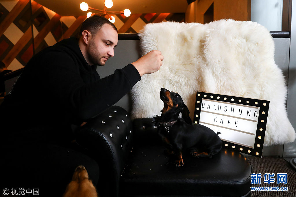 当地时间2018年8月19日,英国伦敦,民众带着宠物达克斯猎肠狗造访达克斯猎肠狗快闪咖啡馆。(图片来源:视觉中国)
