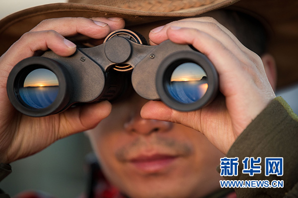 7月7日,在肯尼亚马赛马拉大草原奥肯耶保护区,卓强用望远镜观察保护区情况。新华社记者 吕帅 摄