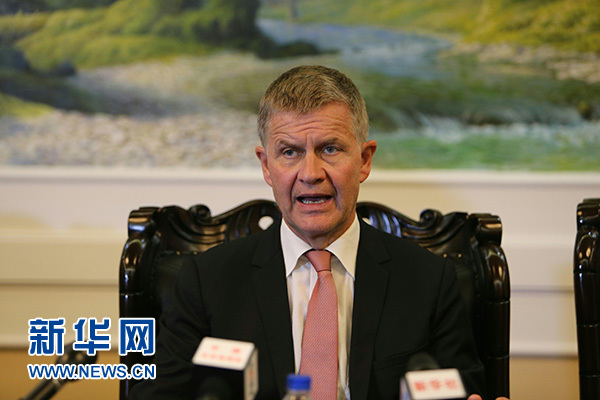 8月24日,在朝鲜平壤,联合国副秘书长兼环境规划署执行主任索尔海姆在记者会上发言。新华社记者 程大雨 摄