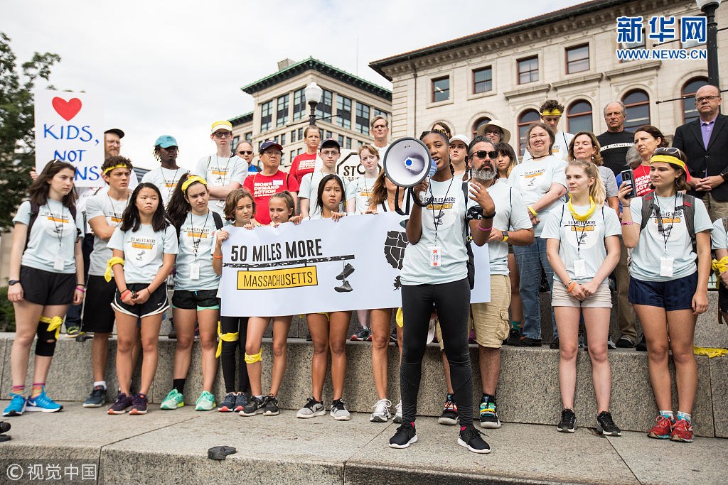 当地时间2018年8月23日,美国马萨诸塞州伍斯特市,帕克兰校园枪击案的幸存者和其他社会活动人士徒步行走50英里前往当地一个武器工厂,举行反对枪支暴力的游行示威活动,他们呼吁美国的年轻人团结起来,参与到推动枪支管制法案改革的努力中。(图片来源:视觉中国)