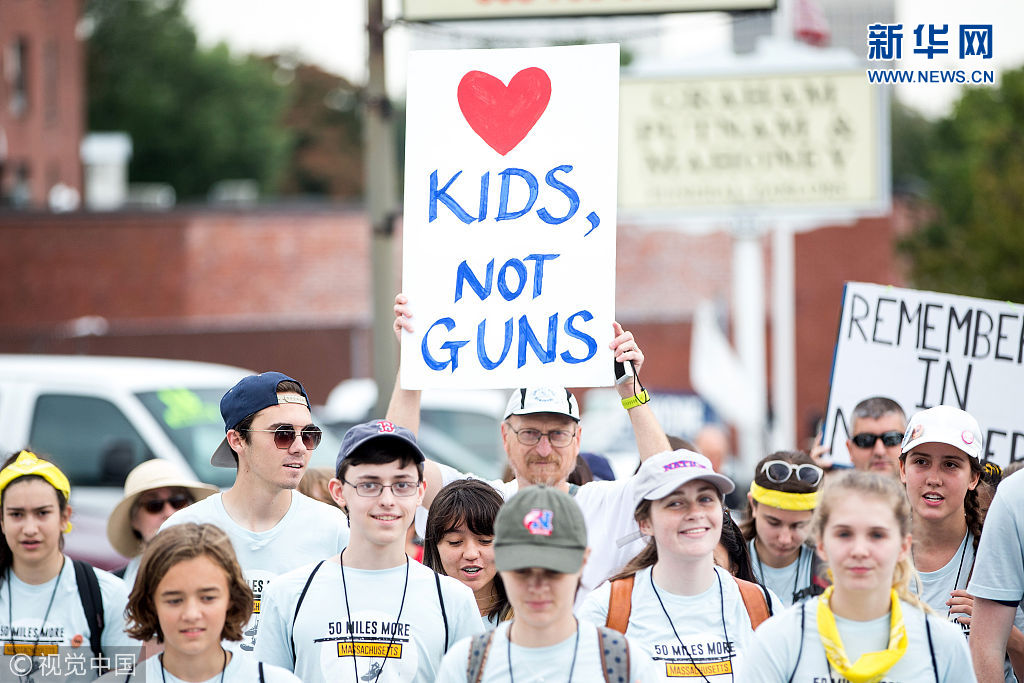 当地时间2018年8月23日,美国马萨诸塞州伍斯特市,帕克兰校园枪击案的幸存者和其他社会活动人士徒步行走50英里前往当地一个武器工厂,举行反对枪支暴力的游行示威活动,他们呼吁美国的年轻人团结起来,参与到推动枪支管制法案改革的努力中。(图片来源:视觉中国)