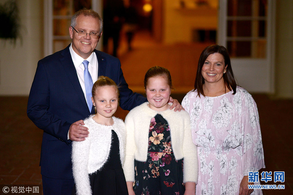 当地时间2018年8月24日,澳大利亚堪培拉,澳大利亚新任总理莫里森宣誓就职。图为莫里森与家人合影。 (图片来源:视觉中国)