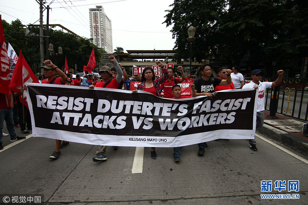 当地时间2018年8月27日,菲律宾马尼拉,数千人走上街头参加游行,呼吁结束劳工契约化和提高最低日薪。(图片来源:视觉中国)
