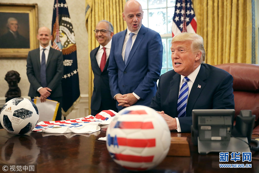 当地时间2018年8月28日,美国华盛顿,美国总统特朗普在白宫椭圆形办公室会见国际足联主席吉安尼讨论2026年在北美举办世界杯事宜。(图片来源:视觉中国)