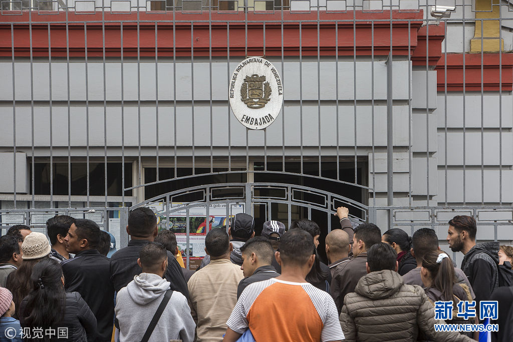 当地时间2018年8月28日,秘鲁利马,委内瑞拉移民在委内瑞拉大使馆外排队,等待领取护照。为应对难民潮,秘鲁8月25日修订了委内瑞拉人入境秘鲁的条件,要求入境要出示护照。 (图片来源:视觉中国)