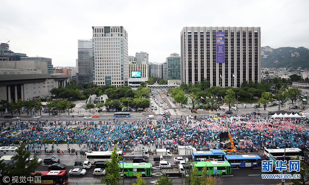 当地时间2018年8月29日,韩国首尔,韩国小商贩在首尔光化门广场举行集会,抗议政府近期大幅提高最低薪酬。(图片来源:视觉中国)