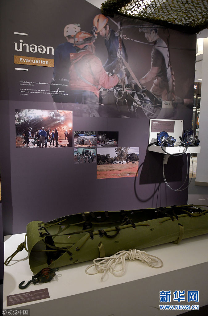 当地时间2018年8月30日,泰国曼谷,在暹罗百丽宫举办的互动展览上,在溶洞救援中使用的救援设备进行展出。6月23日,泰国少年足球队“野猪”队12名少年足球队员和1名教练进入清莱府一处洞穴后因暴雨洪水与外界失联,经多国搜救队伍集体救援,终于在7月10日全部获救。(图片来源:视觉中国)