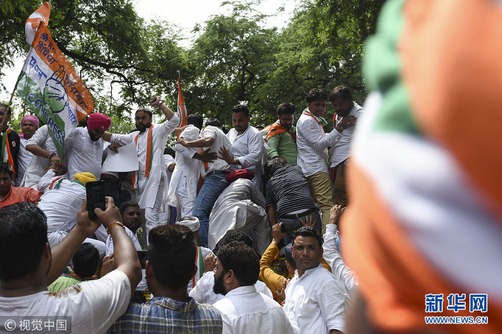 当地时间2018年8月30日,印度新德里,印度反对党国大党的支持者举行反对政府购买法国阵风战斗机的抗议活动。国大党声称,政府在向法国购买36架阵风战斗机时所支付的费用高于与法国政府商定的最终价格。印度政府否认了这一指控,并拒绝透露采购协议中的保密条款。(图片来源:视觉中国)