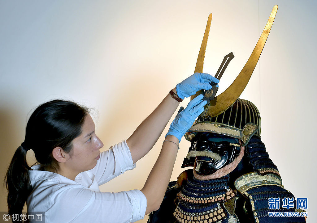 当地时间2018年8月31日,英国伦敦,一套日本江户时期的武士盔甲经过九个月的修复已修复完毕,将于9月底开始展出。(图片来源:视觉中国)