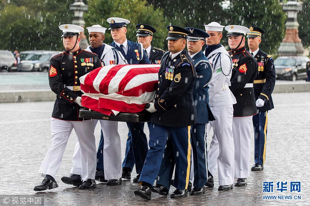 当地时间2018年8月31日,美国华盛顿,美国逝世参议员约翰·麦凯恩的灵柩被运送至美国国会大厦。麦凯恩的追悼会9月1日将在华盛顿国家大教堂举行,而葬礼将于9月2日在美国马里兰州安纳波利斯的美国海军学院举行。(图片来源:视觉中国)
