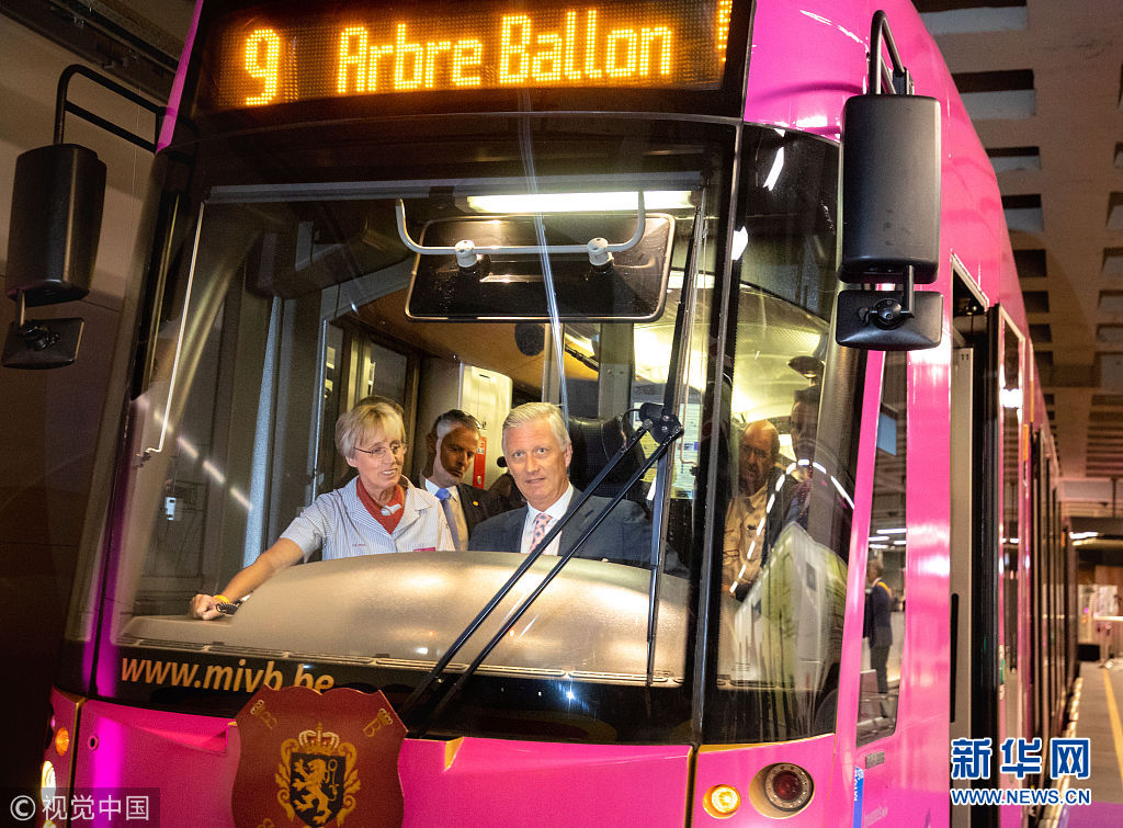 当地时间2018年9月1日,比利时布鲁塞尔,比利时国王菲利普在当地官员的陪同下试乘新开通的9号线有轨电车。(图片来源:视觉中国)