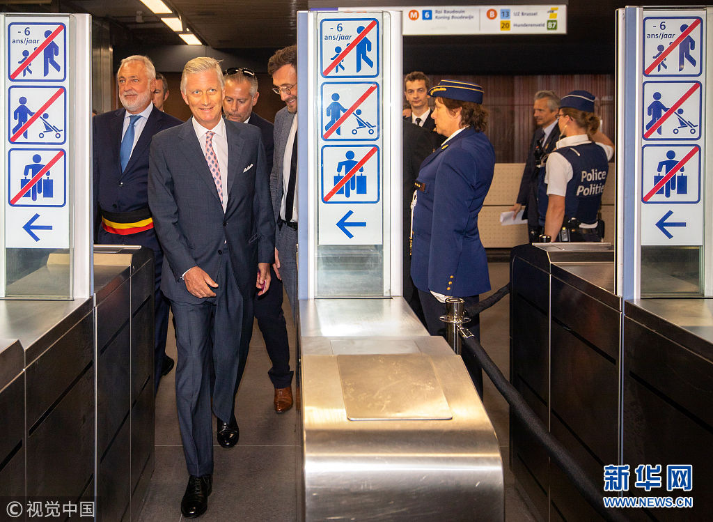 当地时间2018年9月1日,比利时布鲁塞尔,比利时国王菲利普在当地官员的陪同下试乘新开通的9号线有轨电车。(图片来源:视觉中国)