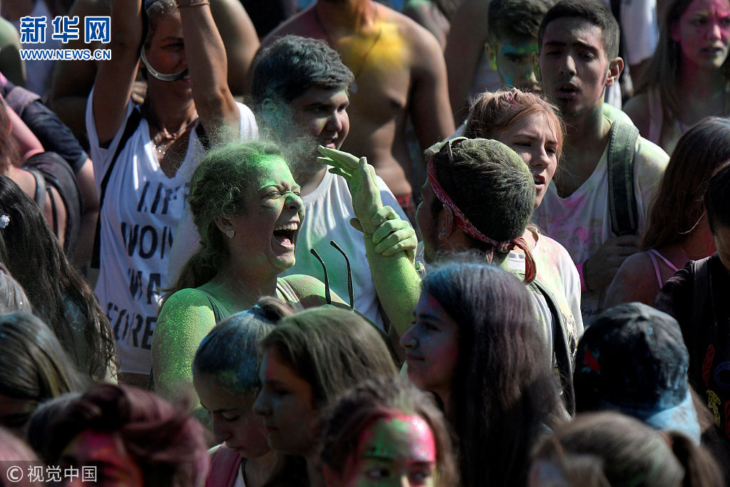 希腊庆祝色彩节 狂欢者抛洒彩色粉末