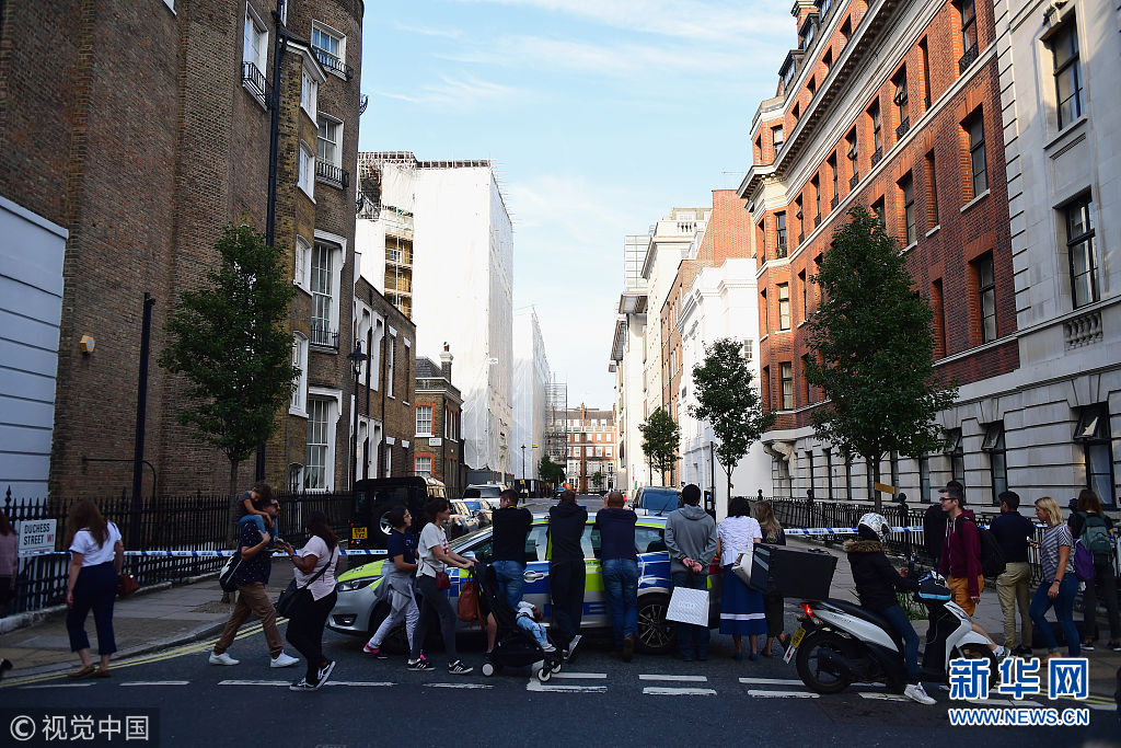 当地时间2018年9月3日,英国伦敦,英国广播电台(BBC)外出现一辆可疑车辆,警方拆弹小组用一个机器人对可疑货车进行了3次控制爆炸。(图片来源:视觉中国)