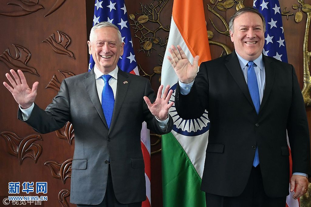 当地时间2018年9月6日,印度新德里,美国和印度6日在印度首都新德里举行首次由两国外长和防长参加的“2+2”对话会。双方在会谈中表示同意加强两国国防和安全合作。(图片来源:视觉中国)