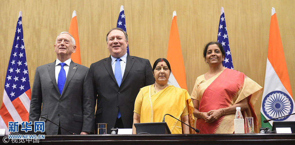 当地时间2018年9月6日,印度新德里,美国和印度6日在印度首都新德里举行首次由两国外长和防长参加的“2+2”对话会。双方在会谈中表示同意加强两国国防和安全合作。(图片来源:视觉中国)