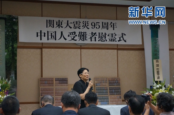 在“东瀛惨案”中遇难的华侨领袖王希天烈士的孙女王旗在悼念仪式上发言。新华社记者严蕾 摄
