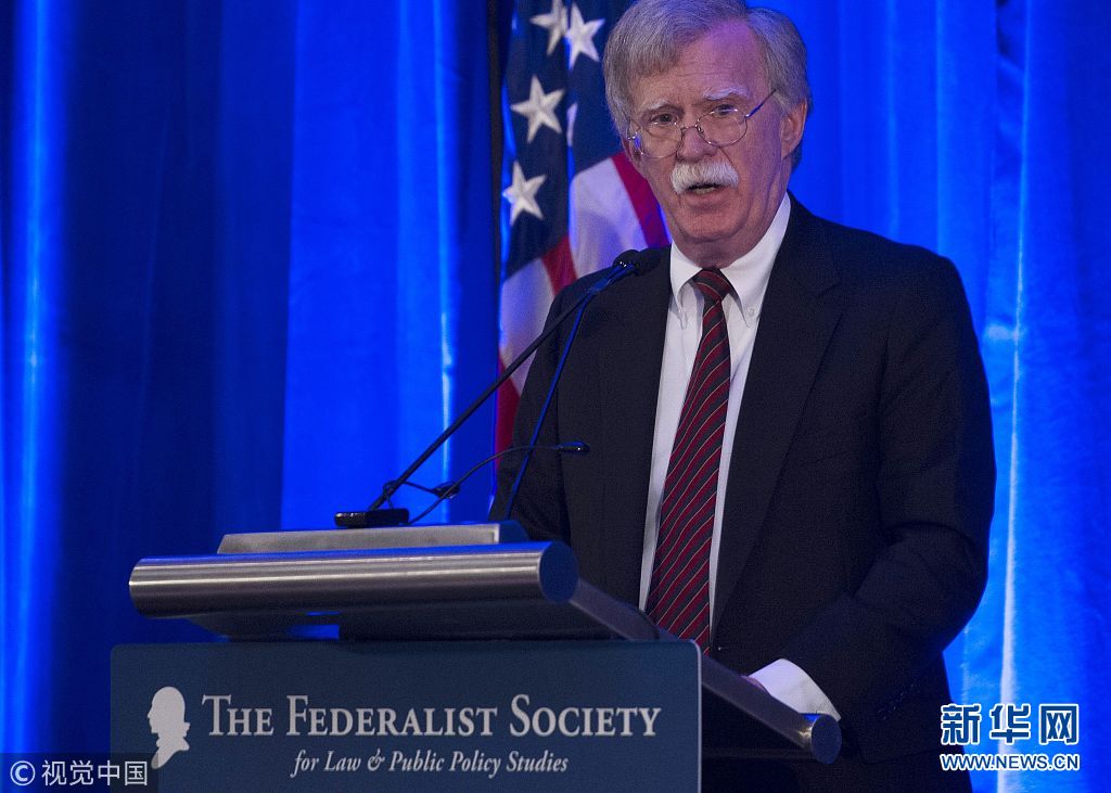 当地时间2018年9月10日,美国华盛顿,美国国家安全顾问博尔顿在“联邦主义者协会”发表午间演讲。当天,博尔顿发表就职后的首次重要演讲,不料路透社先行拿到了他的演讲稿。演讲稿显示,美国将对海牙国际刑事法院(ICC)采取强硬姿态,威胁称如果继续调查“美国人在阿富汗犯下的战争罪行”,美国将对相关法官和检察官实施制裁,包括禁止入境、冻结资产等。(图片来源:视觉中国)