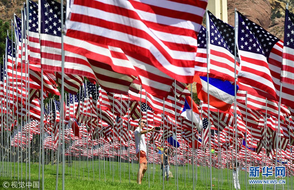 当地时间2018年9月10日,美国加利福尼亚马里布,游客在佩珀丁大学参观“国旗飘扬”展览。该展览每年举行,以纪念2001年9月11日“9·11”恐怖袭击的受害者。(图片来源:视觉中国)