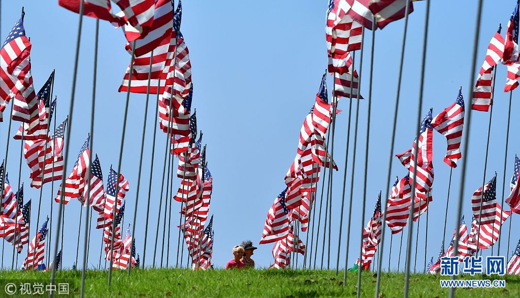 当地时间2018年9月10日,美国加利福尼亚马里布,游客在佩珀丁大学参观“国旗飘扬”展览。该展览每年举行,以纪念2001年9月11日“911”恐怖袭击的受害者。(图片来源:视觉中国)