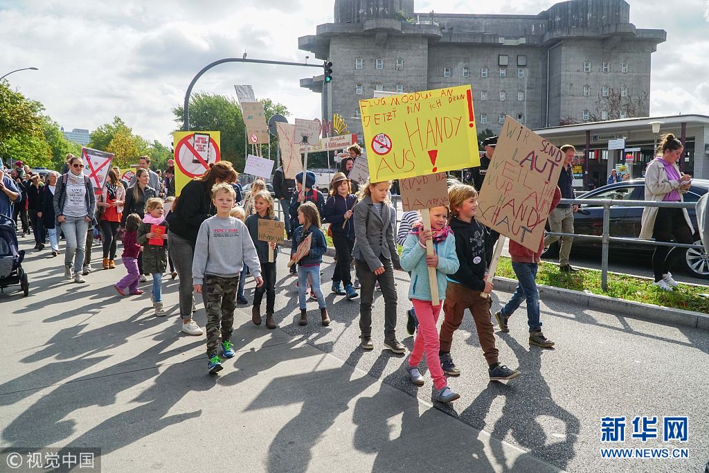 当地时间2018年9月8日,德国汉堡,当地儿童举行示威活动,抗议当代成年人对智能手机“上瘾”。(图片来源:视觉中国)