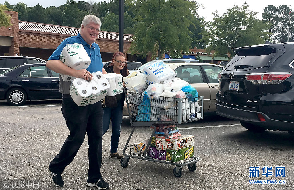 当地时间2018年9月11日,美国北卡罗莱纳,民众超市购买必需品。美国有线电视新闻网(CNN)11日报道称,美国东海岸南部周二(11日)将迎来飓风“佛罗伦萨”,目前风速已经达到每小时140英里,强度接近5级。(图片来源:视觉中国)