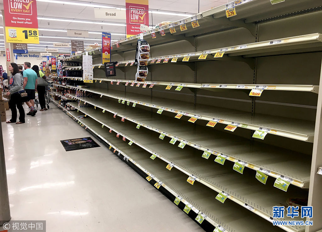 当地时间2018年9月11日,美国北卡罗莱纳,民众超市抢购。美国有线电视新闻网(CNN)11日报道称,美国东海岸南部周二(11日)将迎来飓风“佛罗伦萨”,目前风速已经达到每小时140英里,强度接近5级。(图片来源:视觉中国)