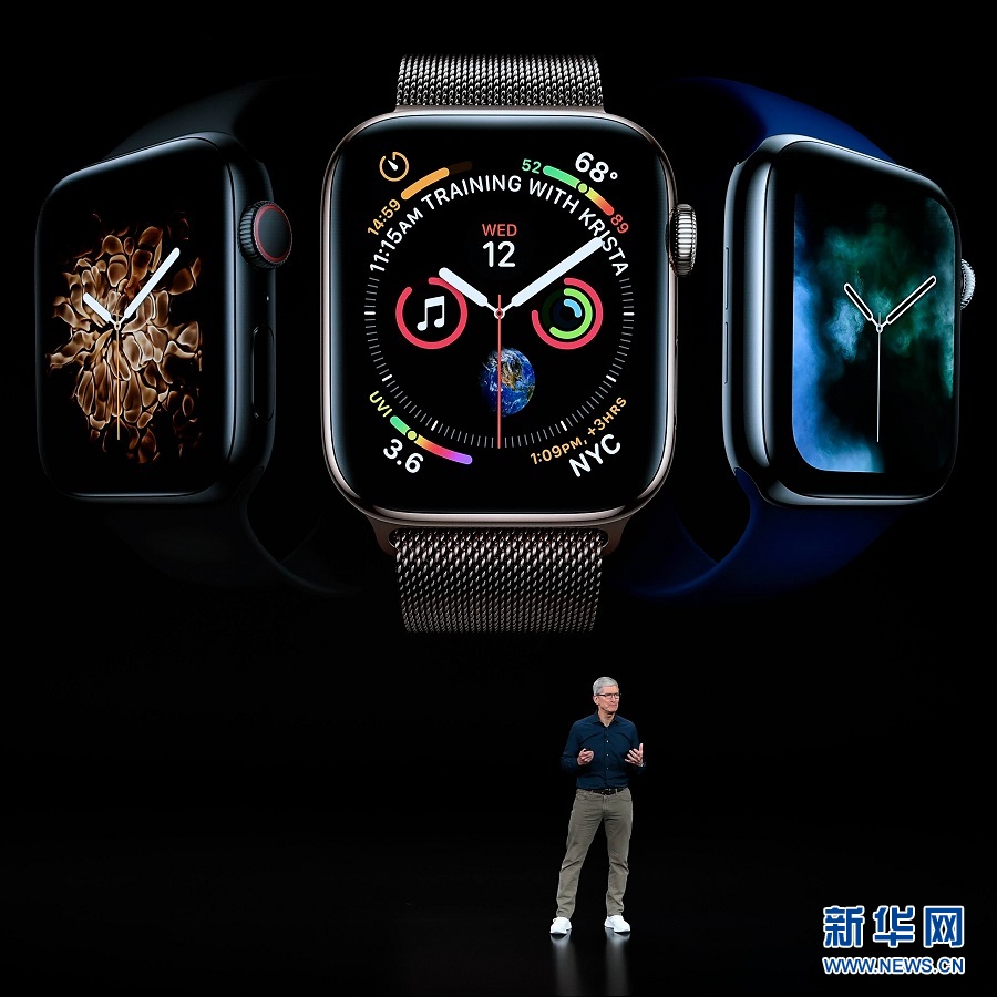 9月12日,在美国加利福尼亚州丘珀蒂诺市举行的苹果新品发布会上,苹果公司首席执行官蒂姆·库克介绍新推出的第四代苹果手表。美国苹果公司12日在加州丘珀蒂诺市举行新品发布会,推出3款智能手机和第四代苹果手表等产品。其中,手机双卡双待功能和手表健康监测应用广受关注。 新华社发