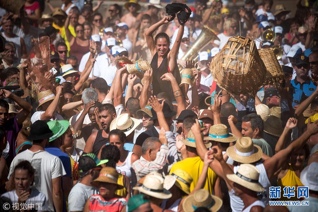 西班牙民众庆祝古老土著文化 2万人齐聚湖边竹篮捞鱼