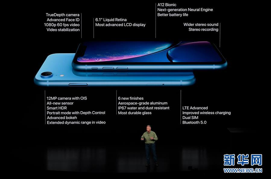 9月12日,在美国加利福尼亚州丘珀蒂诺市举行的苹果新品发布会上,苹果公司全球市场营销高级副总裁菲利普·席勒介绍新推出的苹果手机iPhone XR。新华社发