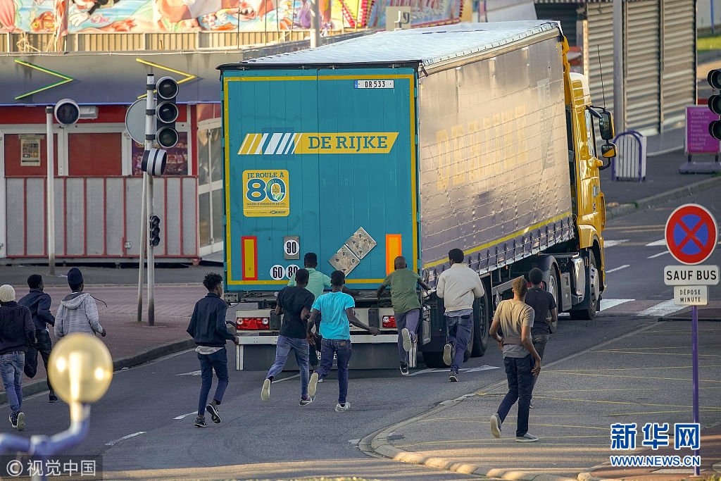 当地时间2018年9月12日,法国乌伊斯特勒昂,移民试图在乌伊斯特勒昂的渡口攀上卡车以便偷渡到达英国。移民大多来自非洲,因为法国当局阻止建立任何营地,他们不得不寻求新的办法偷渡到邻国。(图片来源:视觉中国)