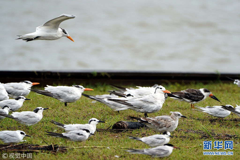 当地时间2018年9月15日,美国北卡罗来纳州,海鸟在沙滩上挤作一团。(图片来源:视觉中国)