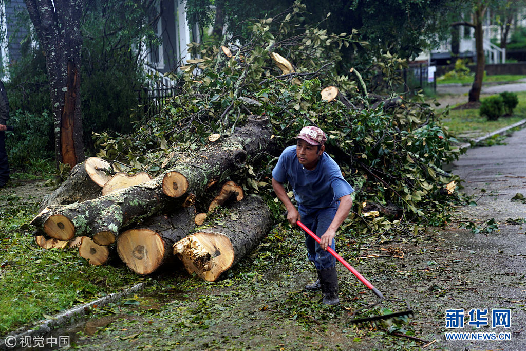 当地时间2018年9月15日,美国北卡罗来纳州,飓风“弗洛伦斯”在美国北卡罗来纳州登陆,狂风将大量树木吹倒。(图片来源:视觉中国)