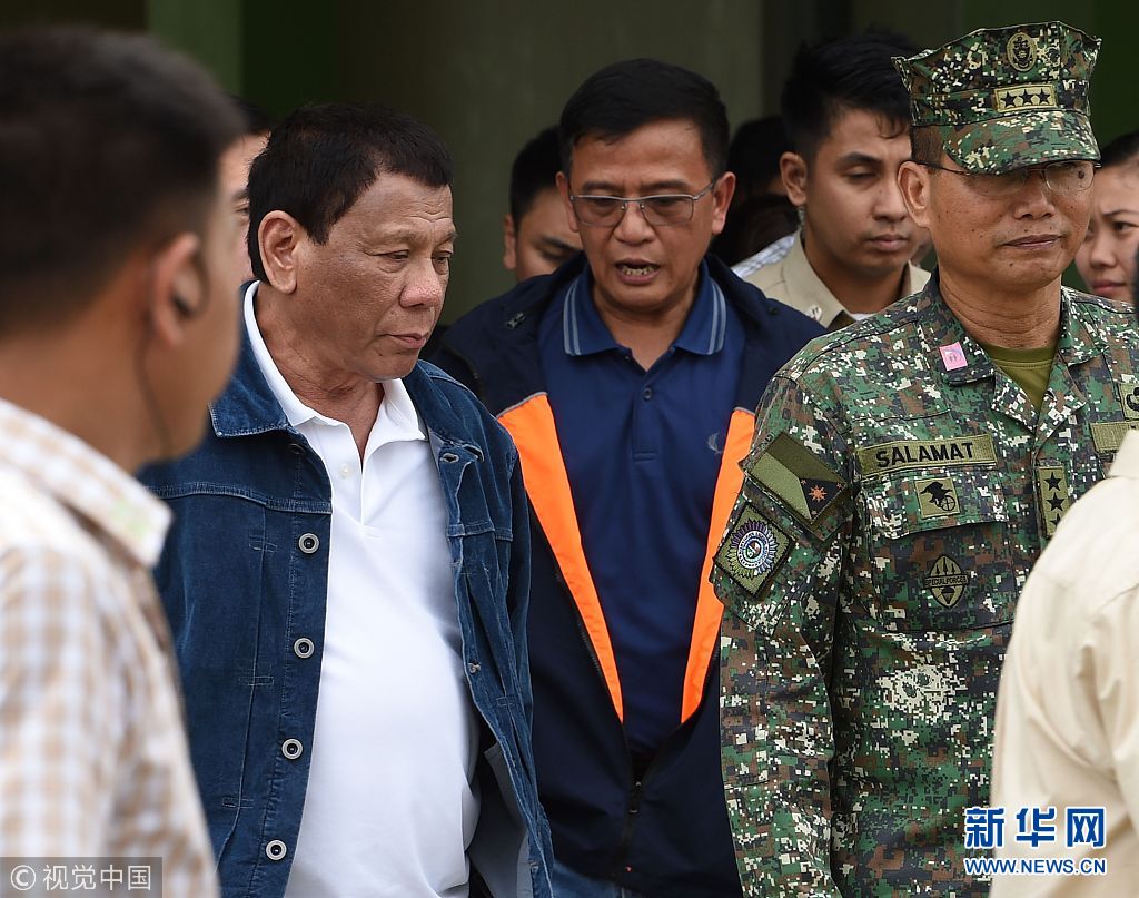当地时间2018年9月16日,菲律宾土格加劳,菲律宾总统杜特尔特抵达当地,将于地方官员讨论台风“山竹”的影响和后果。菲当局陆续疏散吕宋岛上80万人,近一万人已入住临时庇护中心,当局指示吕宋岛多个省份停工停课,至少3座水坝预先泄洪。(图片来源:视觉中国)