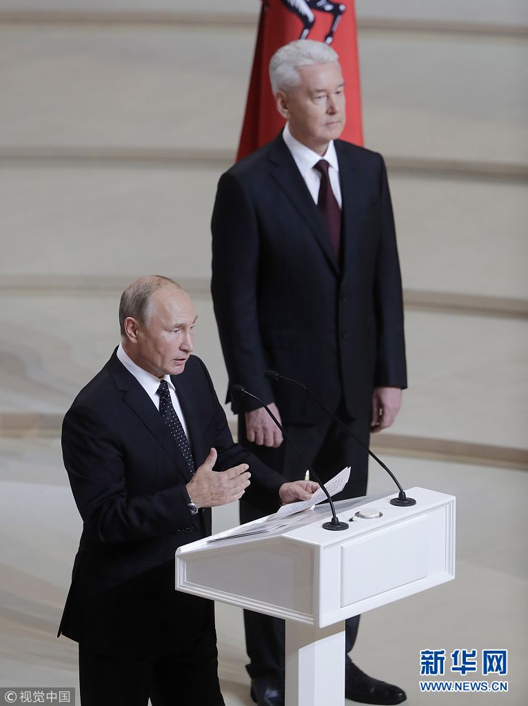 当地时间2018年9月18日,俄罗斯莫斯科,莫斯科市长索比亚宁就职仪式举行,俄罗斯总统普京出席。(图片来源:视觉中国)