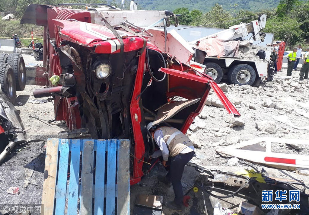 当地时间2018年9月19日,哥伦比亚昆迪纳马卡省Guaduas和萨尔加港之间的公路上,发生两起交通事故,一辆卡车刹车失灵撞上前一起交通事故的救援人员,两起事故共造成8人死亡,14人受伤。(图片来源:视觉中国)
