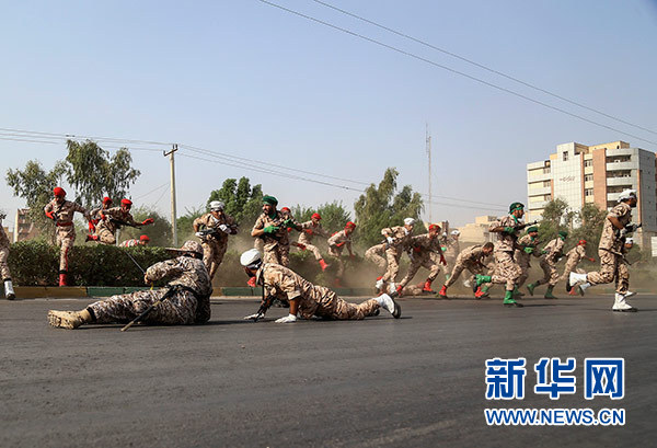 9月22日,在伊朗胡齐斯坦省首府阿瓦士,士兵们躲避袭击。新华社发