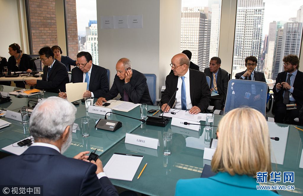 当地时间2018年9月24日,美国纽约,法国外长让-伊夫·勒德里昂、阿拉伯联盟秘书长艾哈迈德·阿布·盖特、欧盟外交事务和安全政策高级代表费代丽卡·莫盖里尼等人就利比亚问题召开会议。(图片来源:视觉中国)