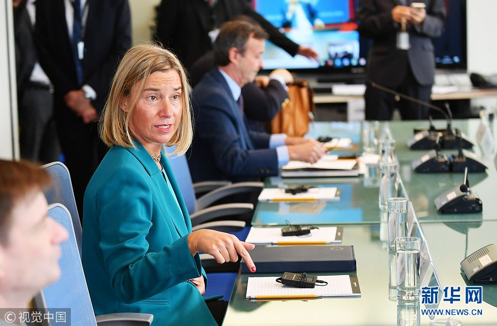 当地时间2018年9月24日,美国纽约,法国外长让-伊夫·勒德里昂、阿拉伯联盟秘书长艾哈迈德·阿布·盖特、欧盟外交事务和安全政策高级代表费代丽卡·莫盖里尼等人就利比亚问题召开会议。(图片来源:视觉中国)