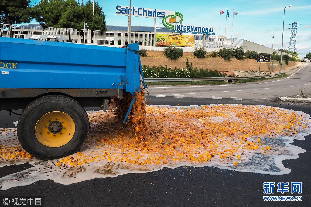 当地时间2018年9月24日,法国佩皮尼昂,法国农业工会的成员在当地水果和蔬菜市场附近的十字路口倾倒水果堵塞交通并焚烧垃圾,抗议政府当局结束对季节性雇工的免税政策。(图片来源:视觉中国)