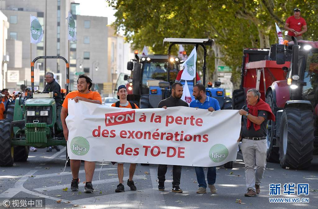 当地时间2018年9月24日,法国阿维尼翁,法国农业工会的成员组织示威活动,并在街道上倾倒水果和垃圾,抗议政府当局结束对季节性雇工的免税政策。 (图片来源:视觉中国)