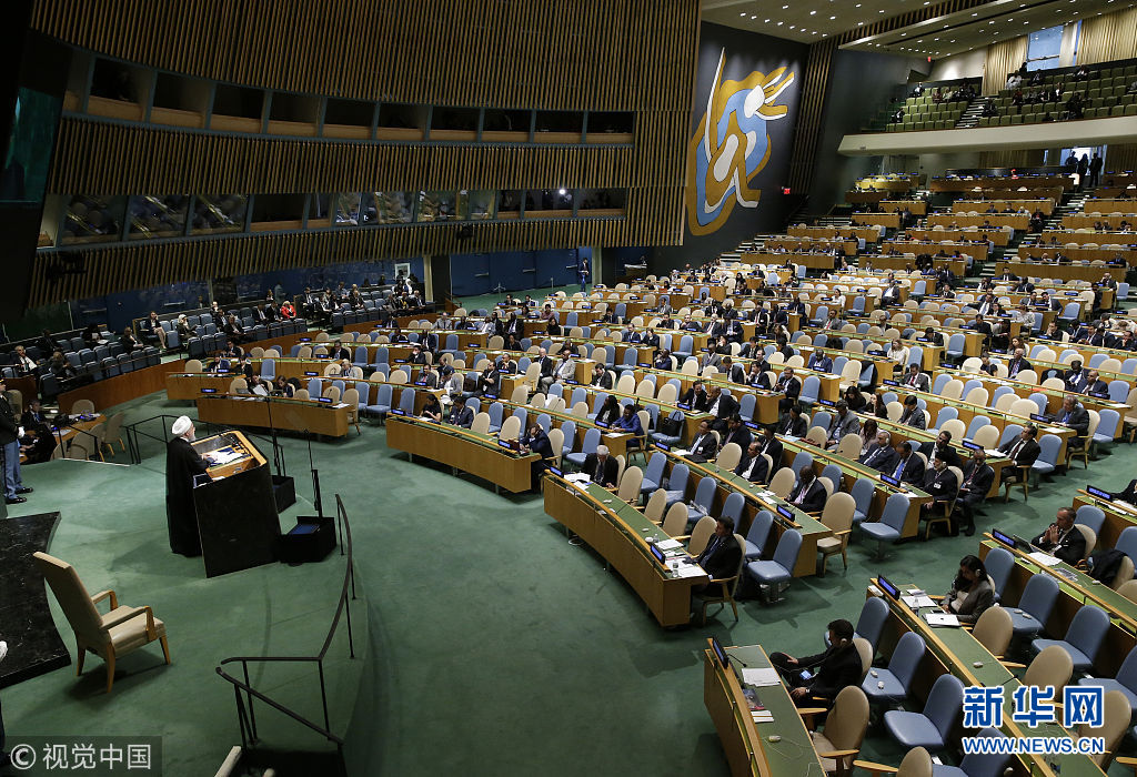 当地时间2018年9月25日,美国纽约,伊朗总统鲁哈尼在纽约联合国总部出席第73届联合国大会一般性辩论并发言。他说,美国对伊朗采取的“敌对政策”是彻底的错误,注定要失败。(图片来源:视觉中国)