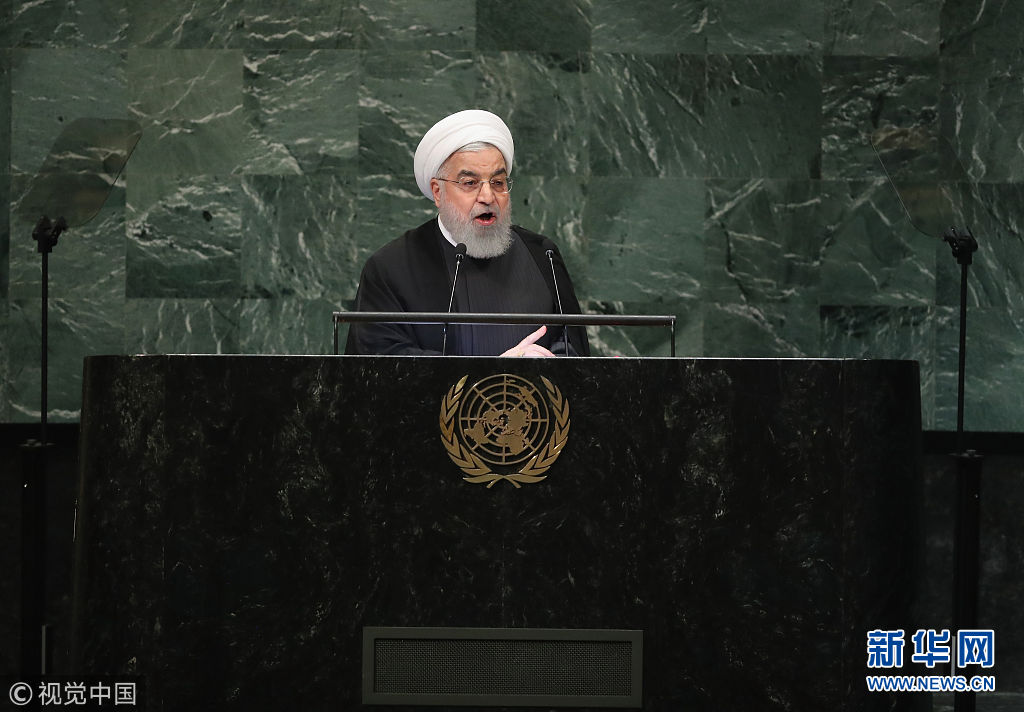 当地时间2018年9月25日,美国纽约,伊朗总统鲁哈尼在纽约联合国总部出席第73届联合国大会一般性辩论并发言。他说,美国对伊朗采取的“敌对政策”是彻底的错误,注定要失败。(图片来源:视觉中国)