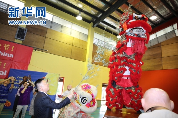图为庆祝活动现场,钱波大使在为舞狮表演者“挂青”。新华社记者张永兴 摄