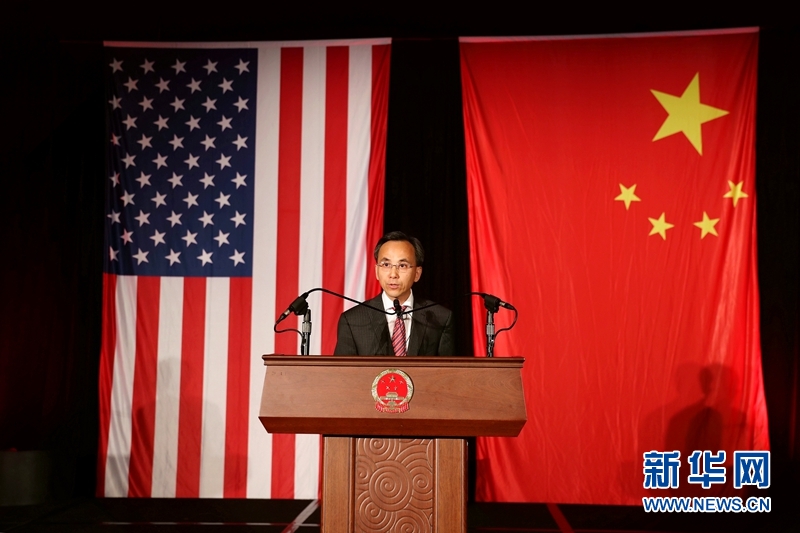 中国驻芝加哥代总领事刘军在中华人民共和国成立69年国庆招待会上致辞。 新华社记者汪平 摄