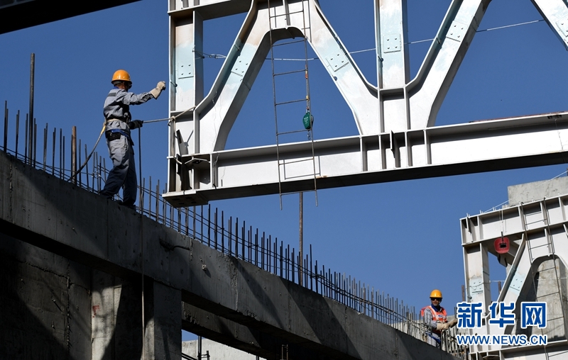 2018年9月8日,阿富汗喀布尔,这是当天在援建项目现场拍摄的景象,工人们正在吊装钢屋架。新华网发 法里德·艾哈迈德摄