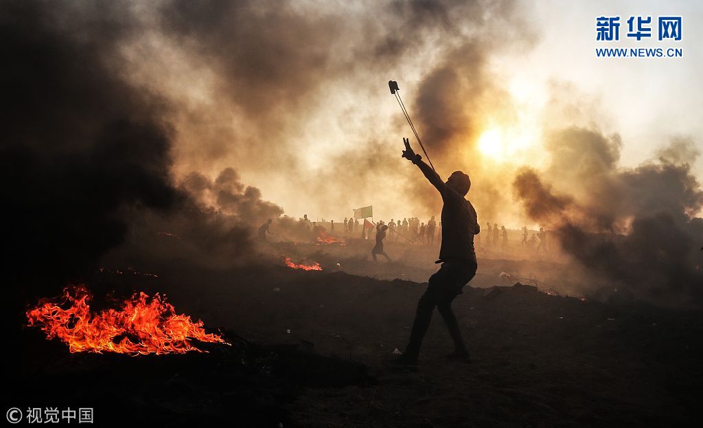 当地时间2018年9月28日,加沙,巴勒斯坦示威者在加沙和以色列边境地区持续举行“回归大游行”。(图片来源:视觉中国)