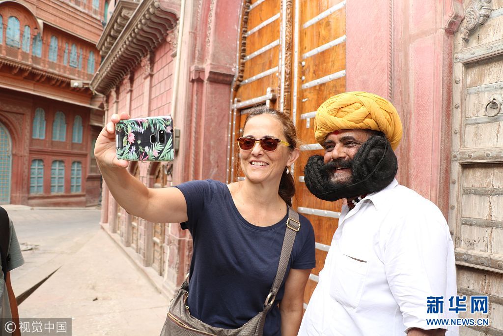 当地时间2018年8月4日,印度拉贾斯坦邦比卡内尔,拥有世界最长的胡子的印度人Girdhar Vyas与游客们合影。Girdhar Vyas从1985年开始蓄须,长达22英尺(约6.7米),打理起来也特别费劲,每天大概要花上3小时梳理抹油。(图片来源:视觉中国)