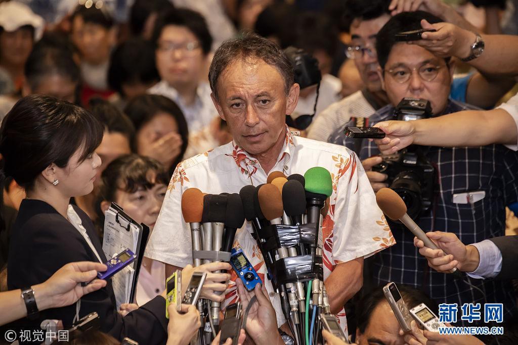 当地时间2018年9月30日,日本那霸,玉城丹尼当选冲绳县知事和支持者庆祝。日本冲绳县知事选举投票结果于当地时间9月30日晚间揭晓,反对将驻日美军普天间基地搬迁至边野古的玉城丹尼当选冲绳县知事。(图片来源:视觉中国)